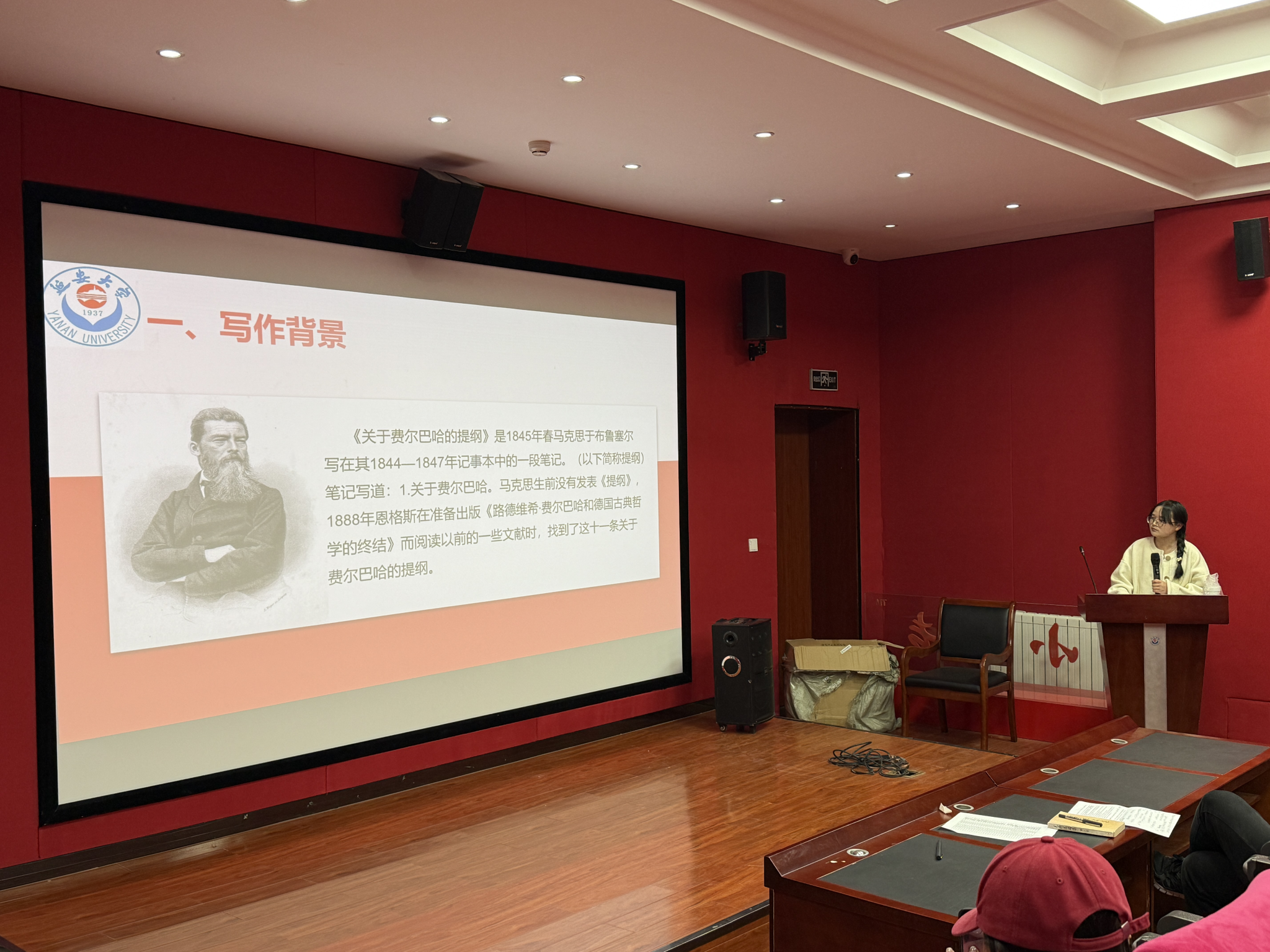 一楼报告厅顺利举行。此次读书会聚焦于马克思主义经典著作,围绕《反对本本主义》《实践论》《矛盾论》以及《关于费尔巴哈的提纲》四部经典文献展开深入研讨。活动中,2024级思想政治教育方向的硕士研究生陈明明、杨帆、王科琳三位同学依次登台,就各自研读经典文献的心得与见解作了详细报告分享。